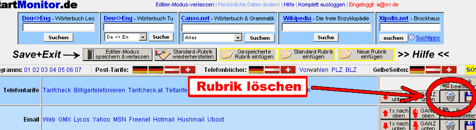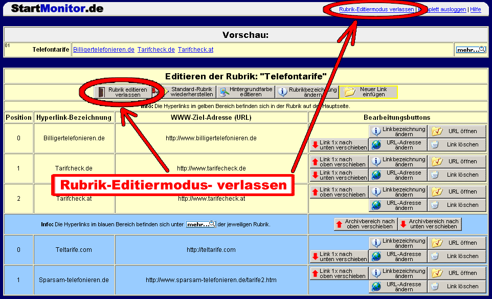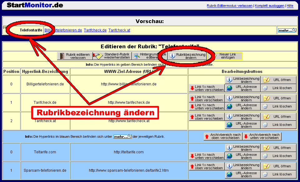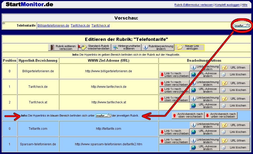 Beispiel: Sie sehen, dass auf der Hauptseite der www.startmonitor.de einige neue Links z.B. bei der Rubrik "Telefontarife" hinzugekommen sind. Sie haben aber in Ihrem Memberbereich noch die alte Rubrik. Mit der Funktion können Sie sehr schnell und einfach jede Rubrik updaten (auf den neuesten Stand bringen).