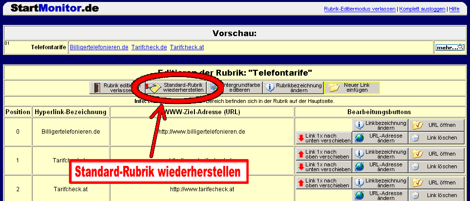 Die Funktion "Standard-Rubrik wiederherstellen" ist auch ganz hilfreich, wenn Sie z.B. aus versehen zu viele Links gelöscht haben. So können Sie schnell den "Urzustand" der Rubrik wiederherstellen.